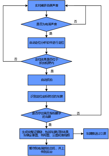 系統(tǒng)的整個抓拍流程如下圖所示。在前端,系統(tǒng)捕獲到機動車鳴笛聲音,啟動定位分析軟件進行定位,如果定位結(jié)果位于抓拍視野范圍內(nèi),則啟動高清相機進行抓拍;根據(jù)定位坐標(biāo),進行相關(guān)車輛的車牌識別,如果能夠識別出符合要求的車牌,則將車牌推送到LED屏顯示,同時生成完整證據(jù)鏈,包括車牌圖片及識別結(jié)果、車輛特寫、車輛全景、鳴笛云圖、鳴笛聲紋圖和鳴笛過程的音視頻(疊加云圖),并將其推送到后臺。