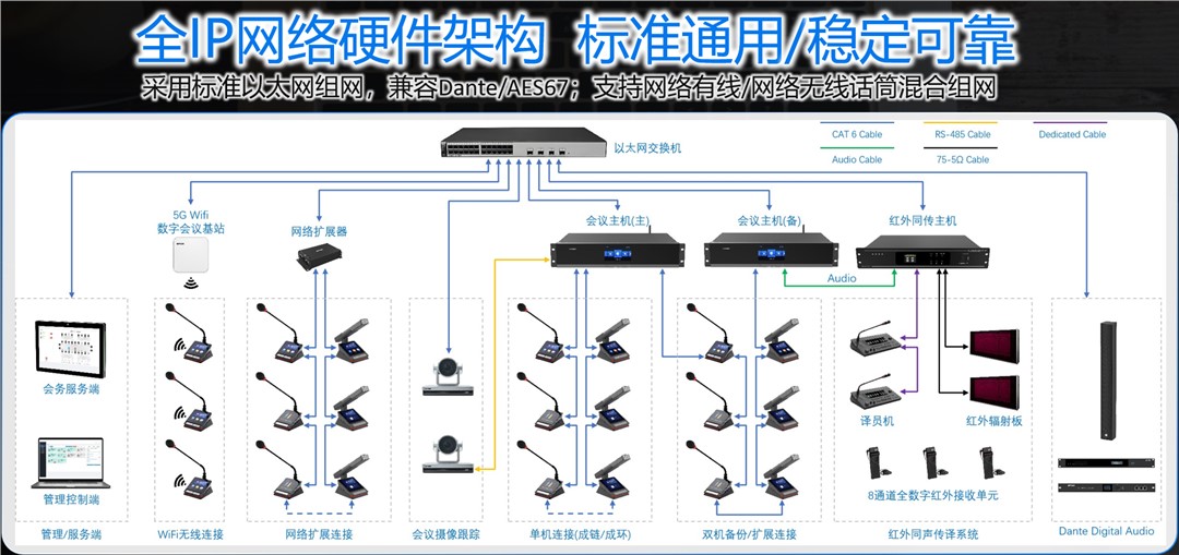 世邦系列作為新一代全數(shù)字網(wǎng)絡(luò)會(huì)議系統(tǒng),其核心優(yōu)勢(shì)在于打破了單一組網(wǎng)的束縛,實(shí)現(xiàn)了“有線(手拉手/星型)+ 無(wú)線”的多重混合組網(wǎng)模式,能夠完美應(yīng)對(duì)各種復(fù)雜場(chǎng)景。