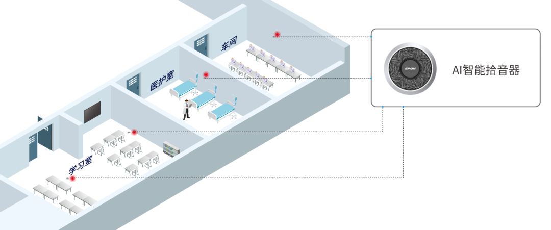 建議在監(jiān)室、車間、學習室等重要區(qū)域部署AI型智能網(wǎng)絡(luò)拾音器,可對周邊環(huán)境噪音的干擾濾除、工頻干擾抑制,提升對人和環(huán)境有效聲音的監(jiān)控,提升聲音復核的語音清晰度。