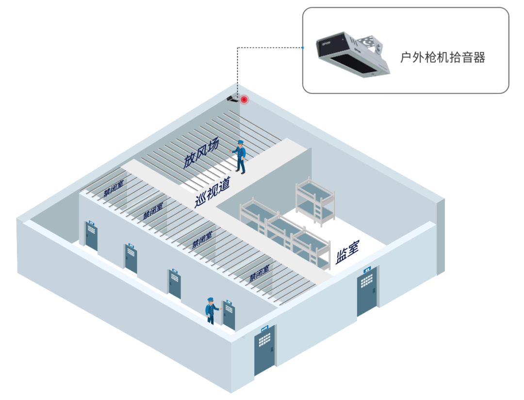 監(jiān)室、禁閉室、監(jiān)獄醫(yī)院、室內(nèi)公共區(qū)域等場景,建議在此多點位部署拾音器,確保做到全天時無死角監(jiān)聽。在側(cè)墻處、天花板處安裝具備防破壞性、隱蔽性高、抗混響設(shè)備。
