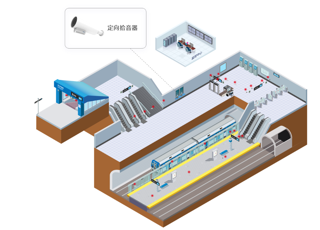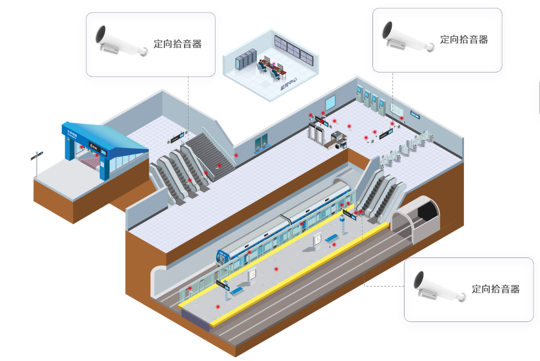 部署方案:通過部署定向型拾音器對主要通道進行聲音監(jiān)控,為事件發(fā)生原因、聚集討論目的、司乘人員糾紛提供依據(jù)降低后期維護成本,提高工作效率。有效預防突發(fā)事件,做到事前預防、事中控制有效、事后處理規(guī)范。