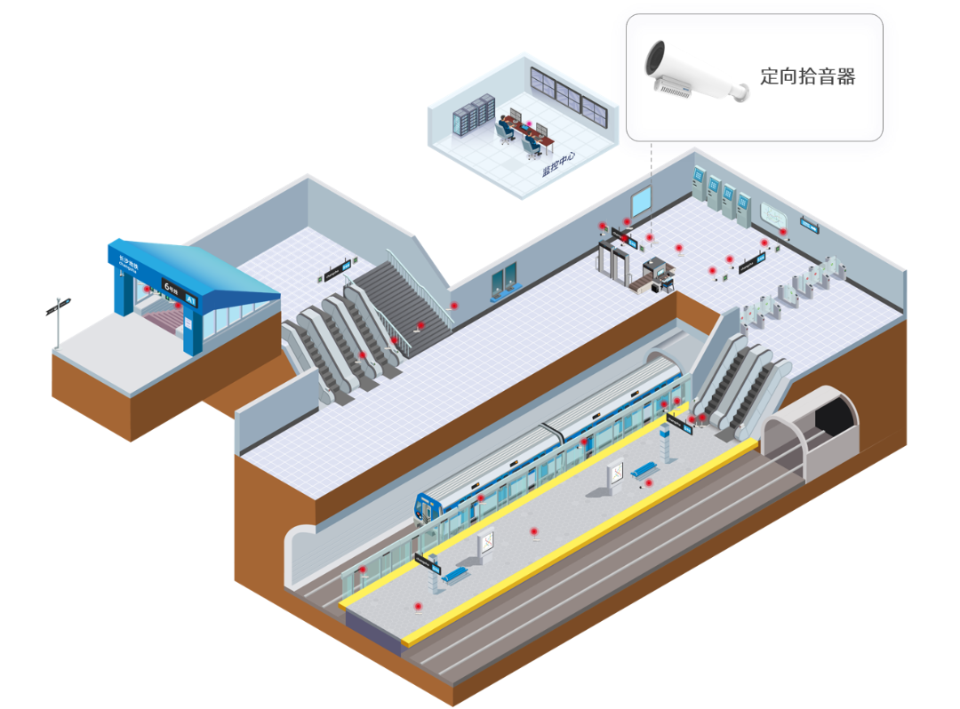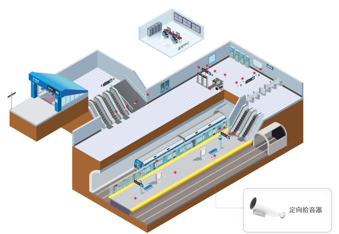 部署方案:通過部署定向型拾音器對乘車等候區(qū)位置進行聲音監(jiān)控,為事件發(fā)生原因、聚集討論目的、司乘人員糾紛提供依據(jù)降低后期維護成本,提高工作效率。有效預防突發(fā)事件,做到事前預防、事中控制有效、事后處理規(guī)范。