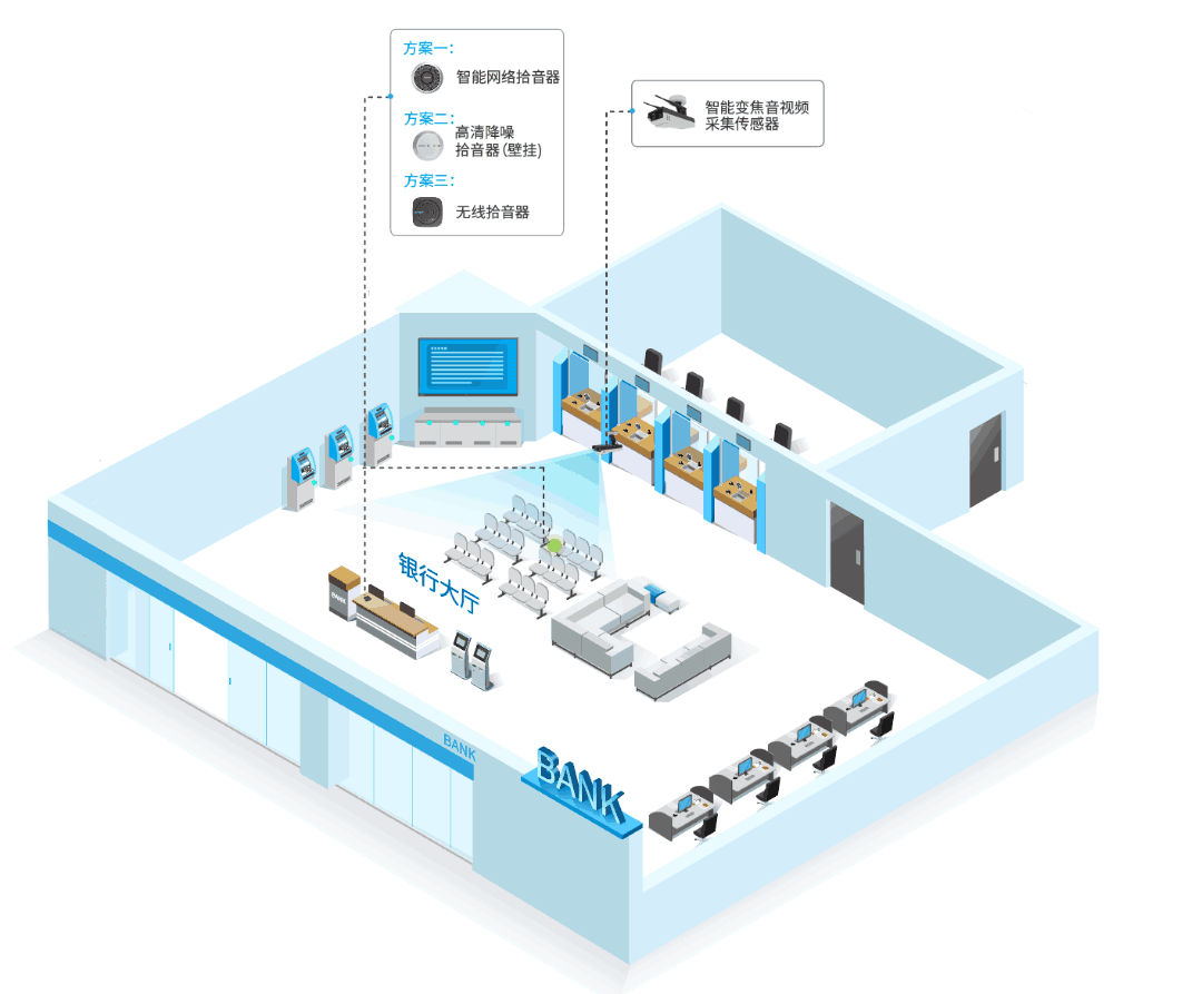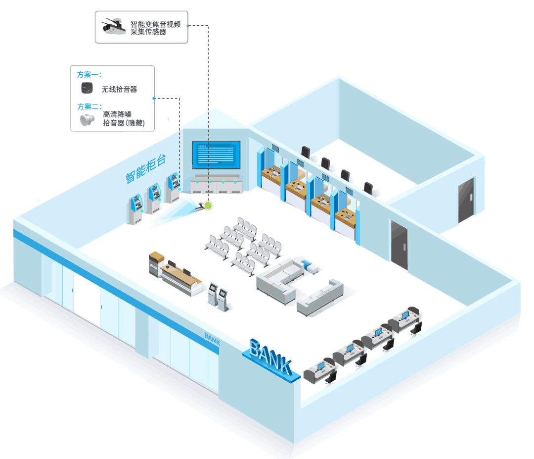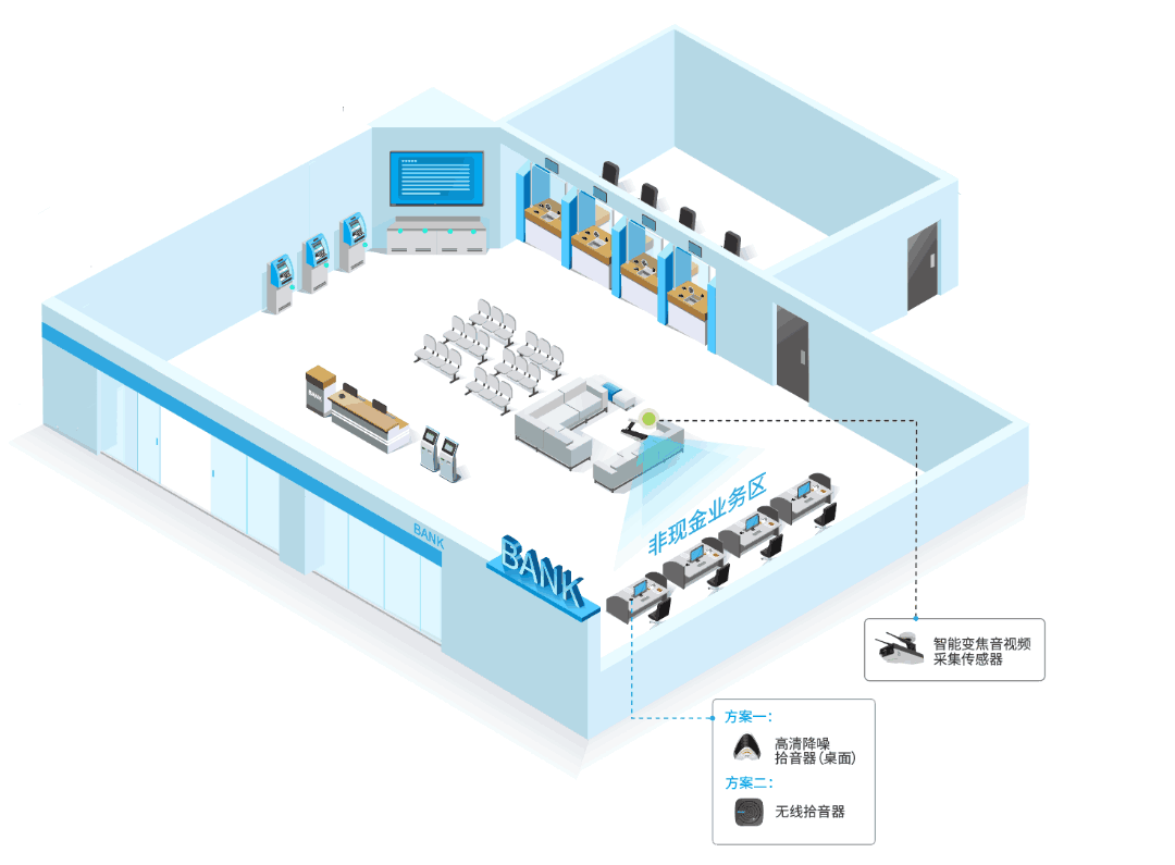 部署方案:在該區(qū)域部署一個(gè)智能變焦音視頻采集傳感器,在每個(gè)非現(xiàn)金柜臺(tái)處布置一個(gè)桌面拾音器(或無(wú)線拾音器)。