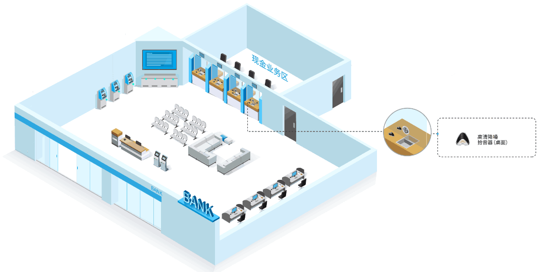 部署方案:在該區(qū)域部署一個(gè)高清晰降噪拾音器(桌面),在每個(gè)現(xiàn)金柜臺(tái)處布置一個(gè)桌面拾音器。