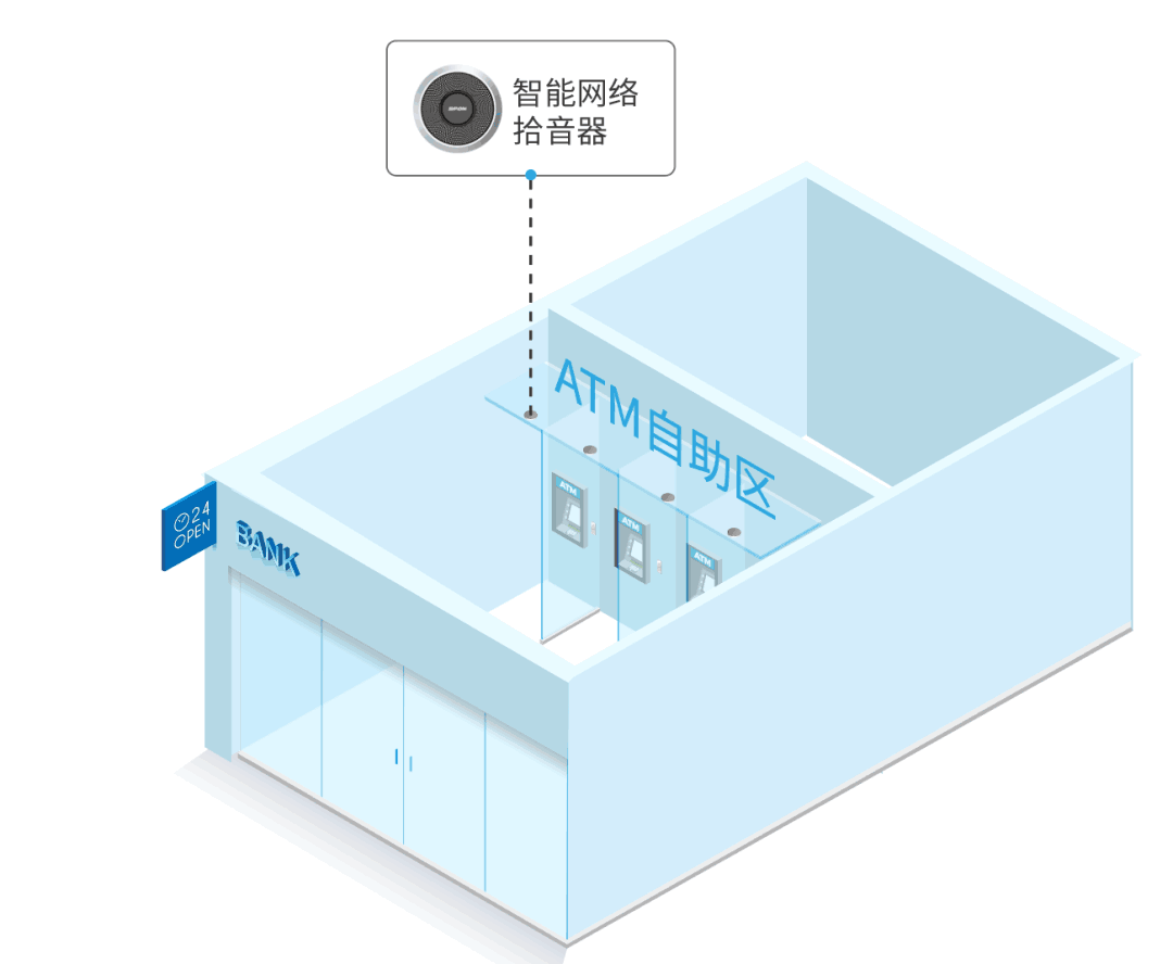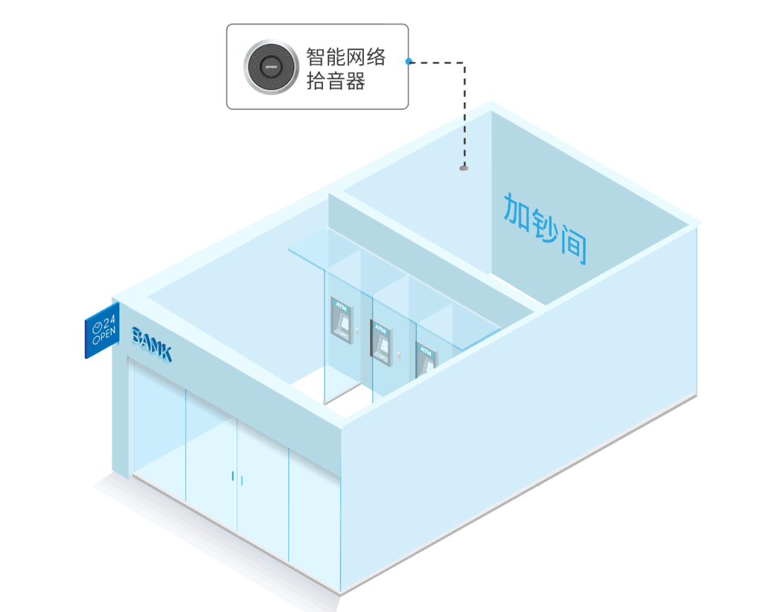 部署方案:在加鈔間吸頂安裝一個(gè)智能拾音器,精準(zhǔn)拾取前端聲音,支持“打、砸、撬、挖、鋸”等異常聲進(jìn)行音頻分析,實(shí)現(xiàn)主動(dòng)預(yù)警功能。