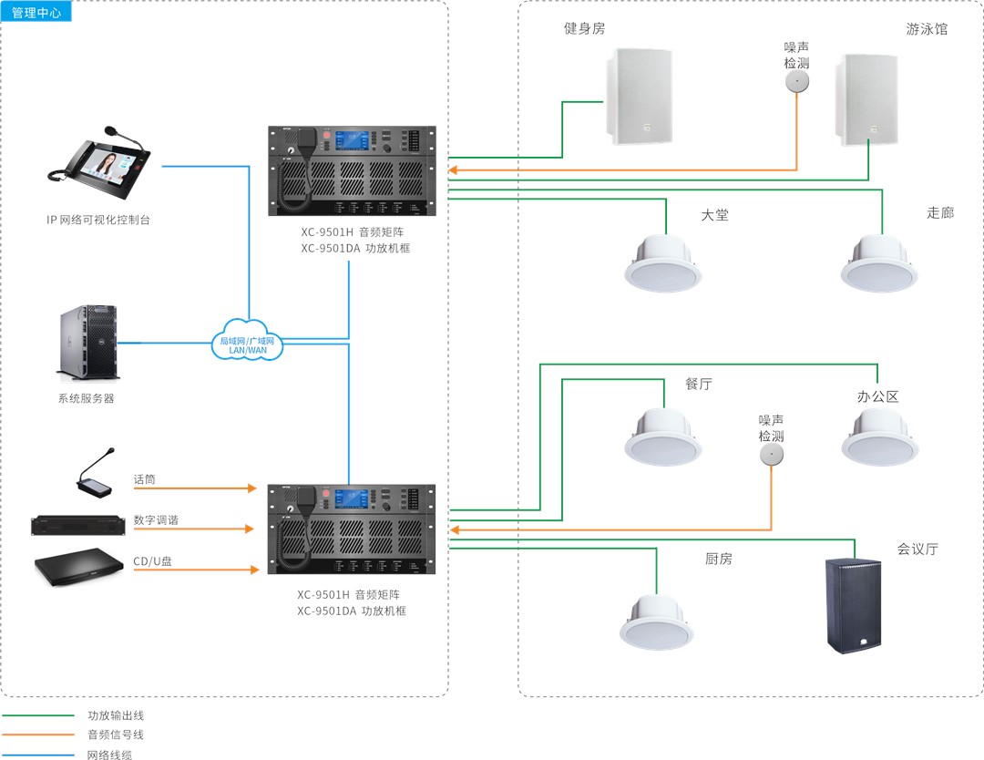 采用矩陣式分區(qū)控制,支持多音源輸入,例如CD、數(shù)字調(diào)諧、模擬話筒等,可實現(xiàn)任意音源輸出到任意分區(qū)終端,各分區(qū)平行運行互不干擾,滿足多場景分區(qū)廣播功能。