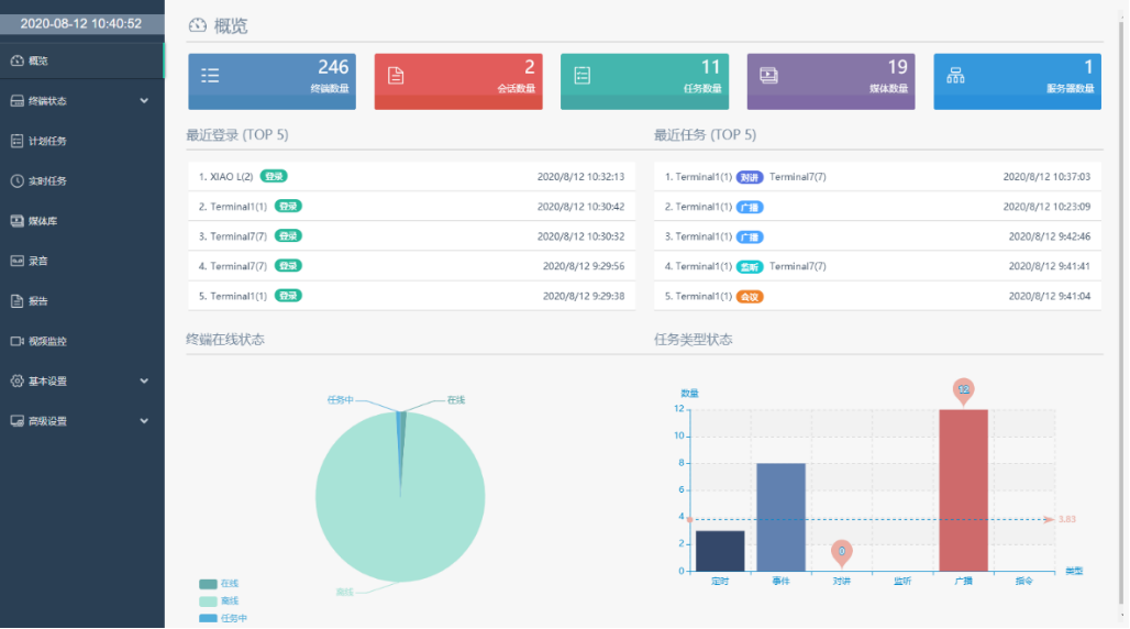 IP網絡音頻系統(tǒng)具有可視化的軟件管理平臺,具有“一張圖”綜合展示界面,可以一覽整個系統(tǒng)的運行情況,包括終端數量、終端運行統(tǒng)計、計劃任務數量、媒體文件數量、服務器數量等等。