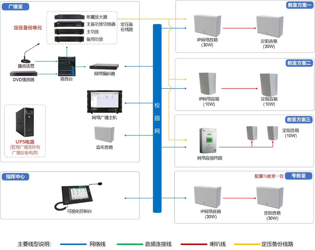 每個教室均設(shè)計單獨廣播分區(qū)控制,提供三種方案選擇。