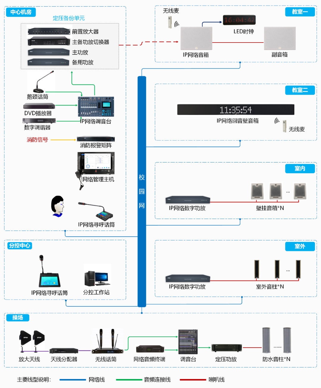 ? 整體設(shè)計(jì)實(shí)現(xiàn)全校范圍內(nèi)統(tǒng)一集中控制管理,能夠全區(qū)廣播。